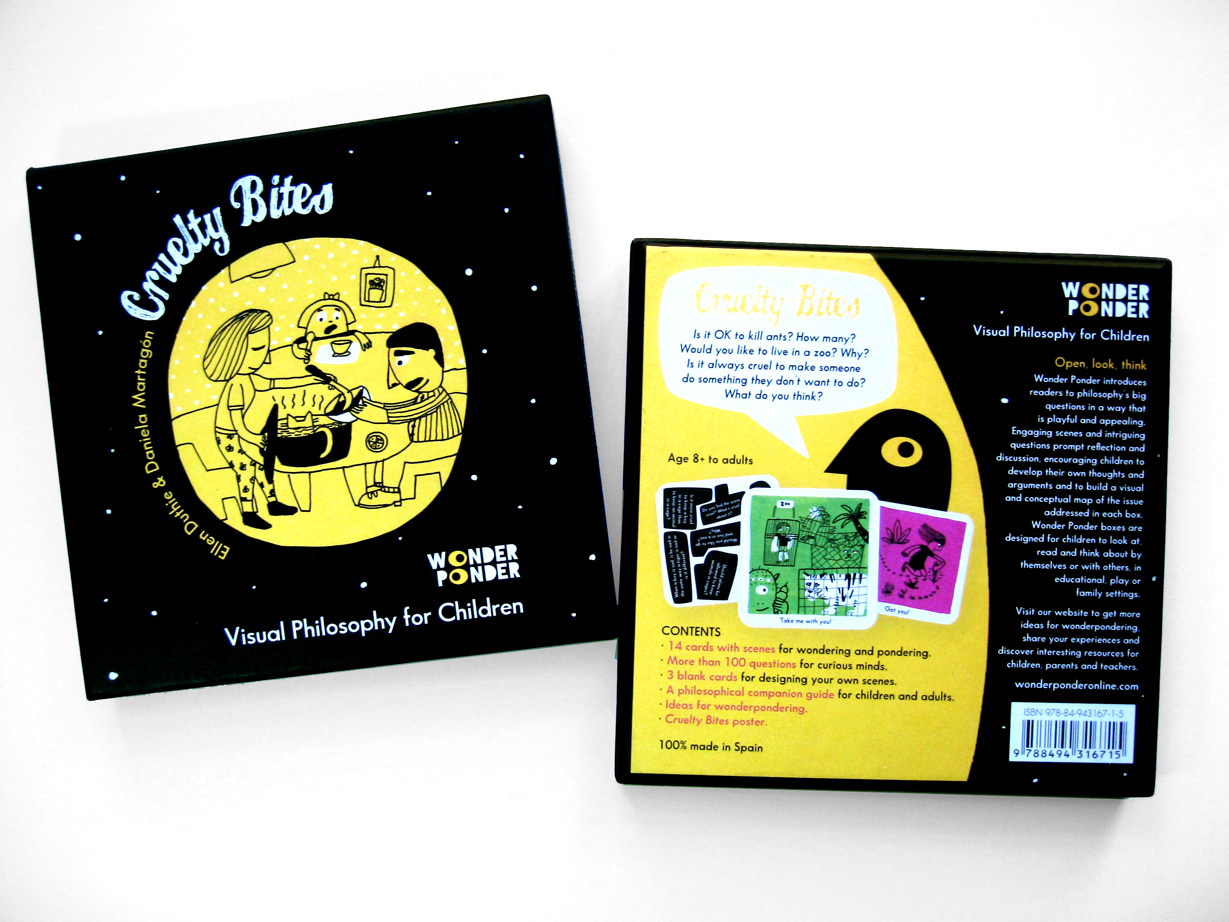 Parents often ask us if we can recommend any books or materials to help them engage their children in philosophical dialogue at home. As it happens, most material specifically designed for philosophical dialogue with kids is intended for a group and requires some preparation on the facilitator’s part. Cruelty Bites, the first in the Wonder Ponder Visual Philosophy for Children series, breaks the mould with an entirely new kind of stimulus that can be used at the dinner table as effectively as in the classroom.