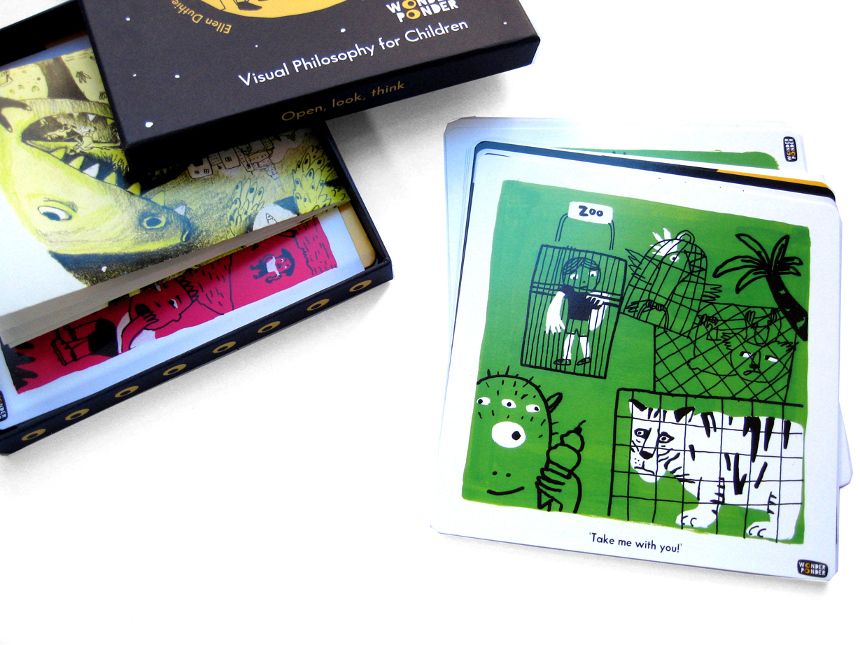 However, the suggestions in the box don’t begin to exhaust the possible ways of utilising these cards. They offer an excellent alternative to ‘I Spy’ or ’10 Green Bottles’ on road-trips. Ask your little philosopher to describe the scenario of their choice, and then let them lead the discussion by reading out their choice of questions. Cards can also be used as time-efficient alternatives to the storybook stimuli traditionally used in communities of philosophical enquiry, or as a way of generating interest in ethical questions at the beginning of a learning unit in the classroom.