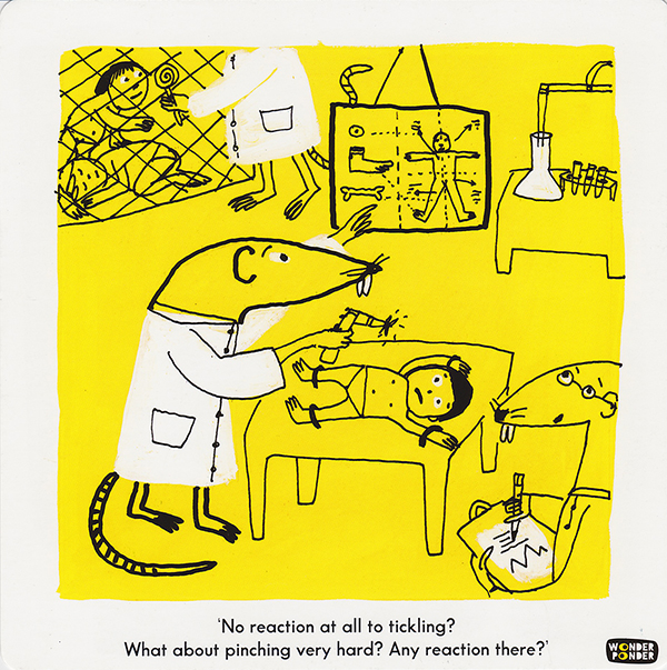 The heart of Cruelty Bites is a boxed set of philosophically-themed cards, each with an illustration on one side and a series of related questions on the other. The illustrations present richly-detailed scenarios that are open to philosophical speculation. One such illustration presents a child strapped down in a laboratory while rats in lab coats poke and prod him. “No reaction at all to tickling?” the caption reads. “What about pinching very hard? Any reaction there?” In the background, we can see a couple of children in a cage, and another rat in a lab coat handing a lollipop to a caged girl, bringing a smile to her face.